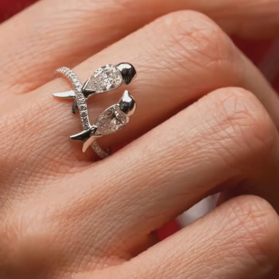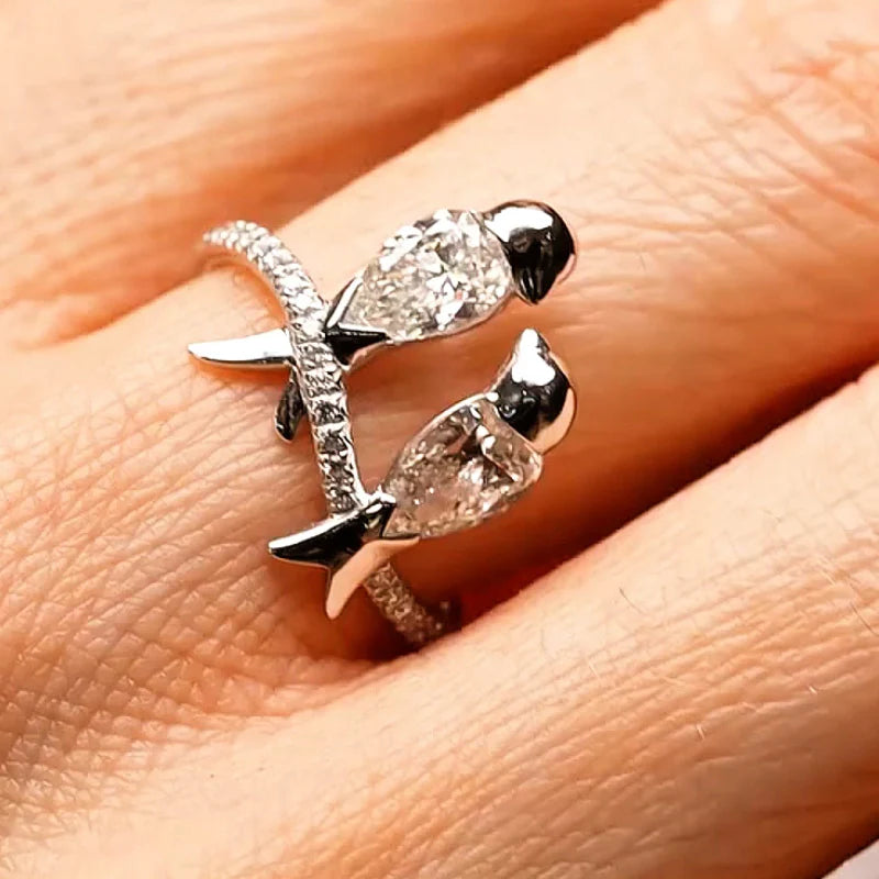 A beautifully coordinated jewelry collection featuring elegant crystal lovebird motifs across a necklace, ring, earrings, and bracelet. Perfect for adding a sentimental sparkle to everyday looks.