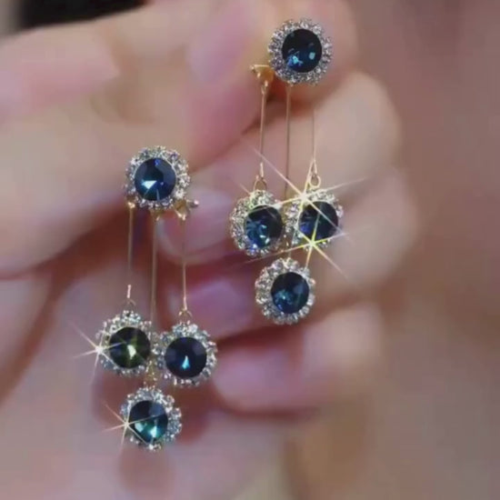 Featuring deep blue sapphire-like stones surrounded by halos, these triple-drop earrings bring a refined, timeless elegance to formal wear.