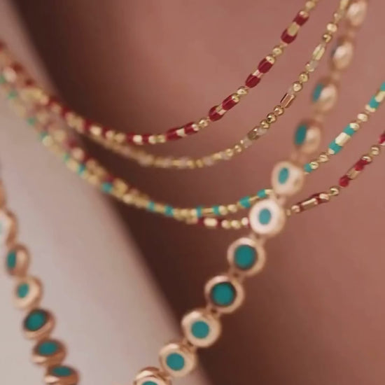 A chic layered necklace with gold palted chains interwoven with colorful enamel accents. Adds a playful yet refined touch to everyday styling.