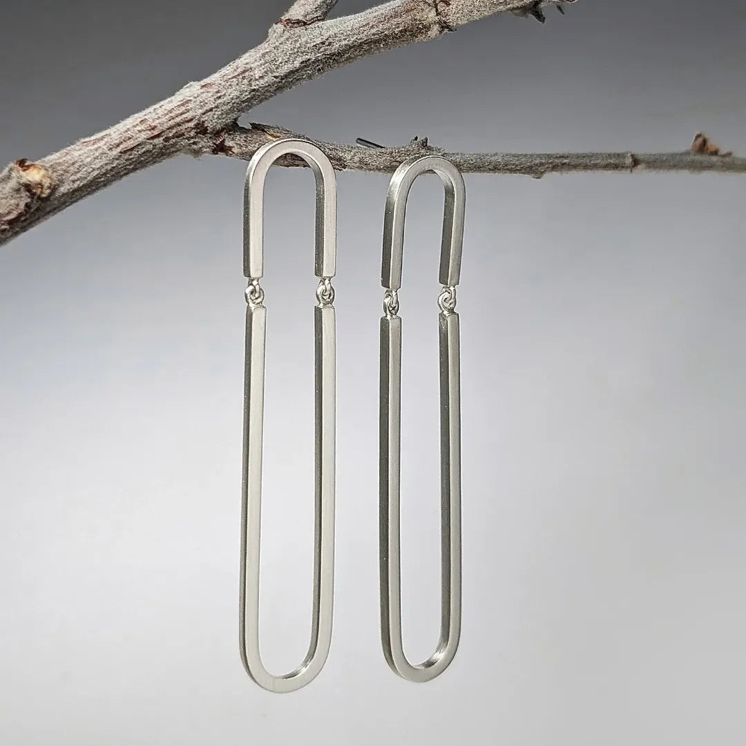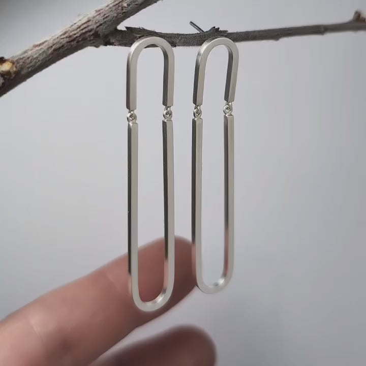 Minimalist and ultra-modern, these geometric silver drop earrings feature an elongated U-shape design suspended from a small upper loop. Crafted from polished silver-tone metal, they deliver a sleek, clean aesthetic perfect for contemporary or professional outfits.