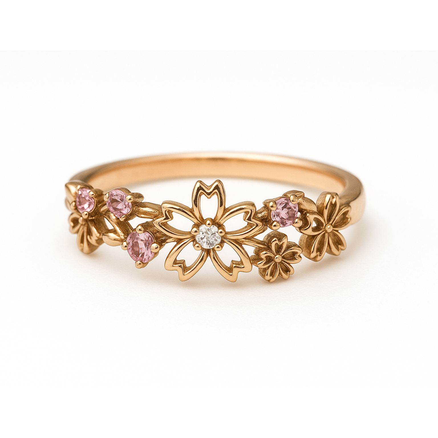 A charming floral ring in gold, adorned with delicate pink and white stones. The centerpiece is a finely cut flower motif, perfect for spring lovers and romantics at heart.