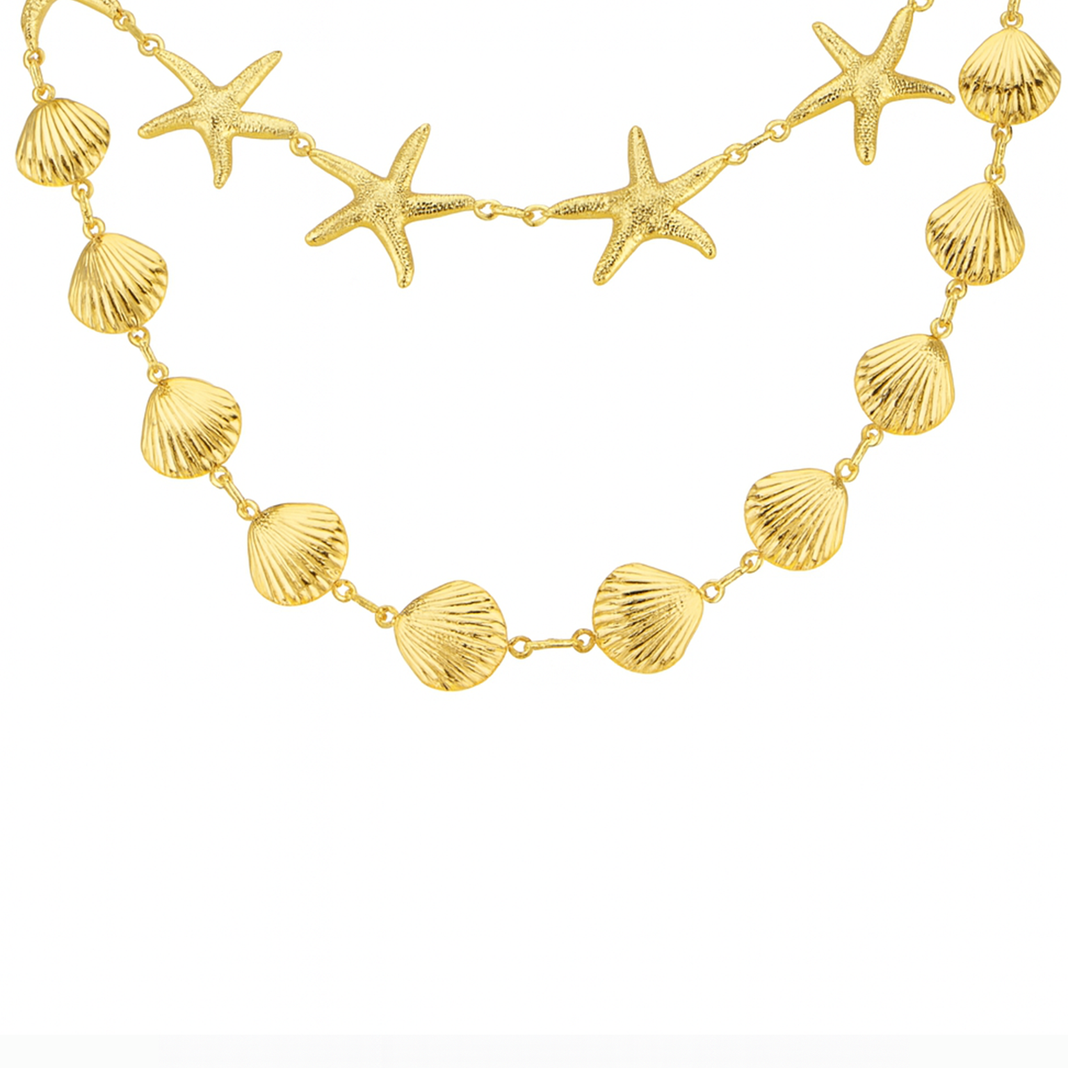 Dive into oceanic opulence with this enchanting two-tier necklace featuring intricately textured gold shells and starfish. The matte finish adds an artisanal feel, perfect for elevating resort wear or adding a playful, luxe twist to summer outfits.