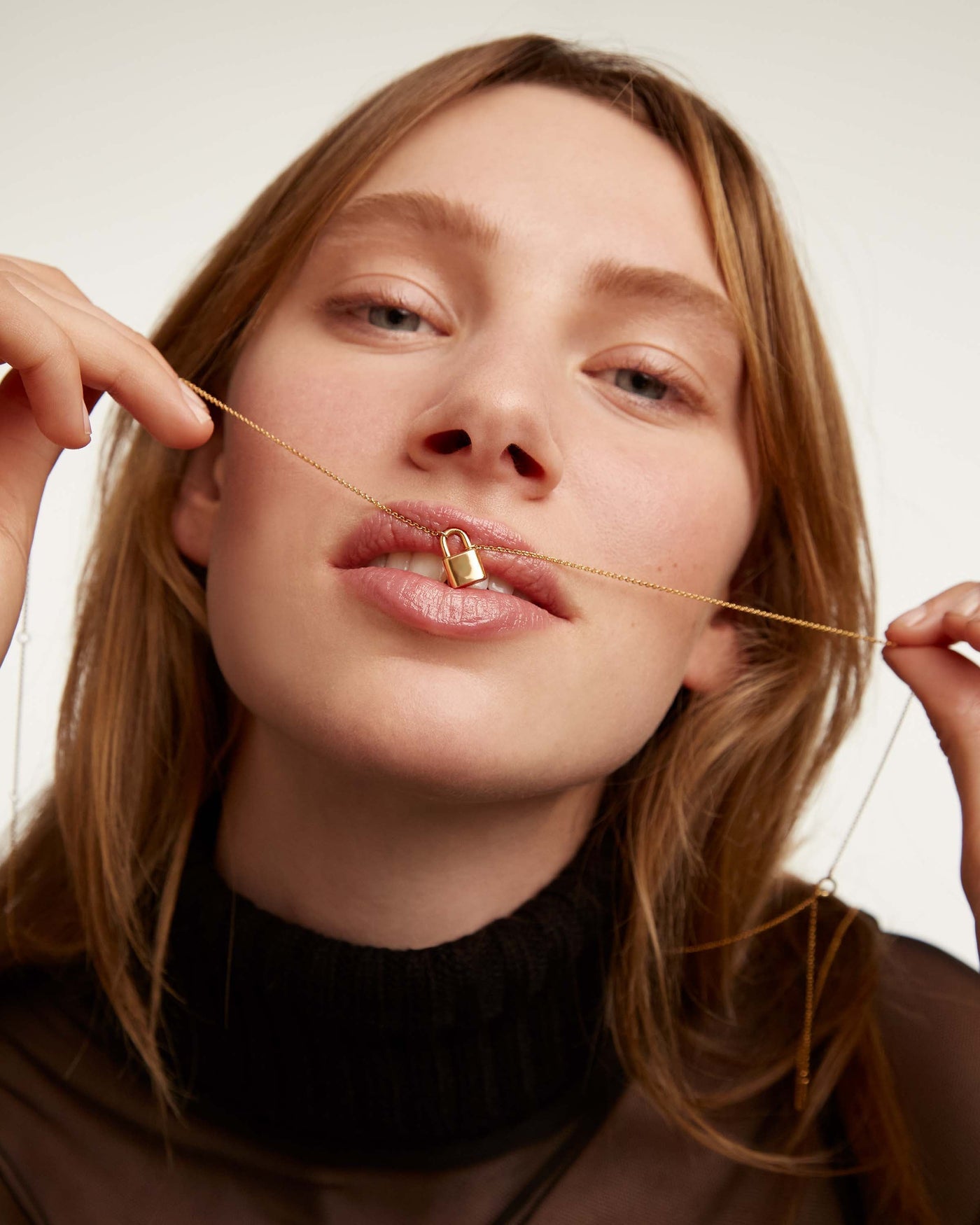 The Selene Lock Pendant Necklace symbolizes strength and security with its polished gold padlock charm. Crafted from stainless steel with an anti-tarnish and anti-allergic coating, this stylish piece adds a modern edge to any look.