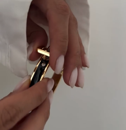 A fashion-forward pair of cuffs shaped like classic belt buckles in black and white enamel, finished in luxe 18k gold plating. These statement pieces are anti-allergic and tarnish-resistant, perfect for stacking or wearing alone.